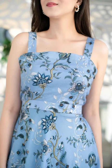 Powder Blue Floral A-Line Fit And Flare Short Dress With Back Bow Tie