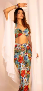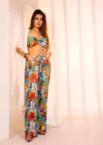 Indulge in the carefree spirit with our showstopper co-ord set. Charming colourful hangings on the halter neck top with bell bottom pants and shrug makes it picture perfect for your holidayss.