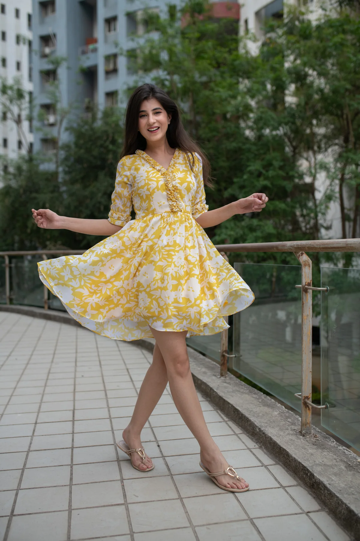Embrace elegance with our Yellow White Floral Short Dress for Women from Label Shaurya Sanadhya. Crafted from georgette, this dress is perfect for adding a touch of freshness to your wardrobe. Ideal for casual outings and summer events, it combines style and comfort effortlessly.